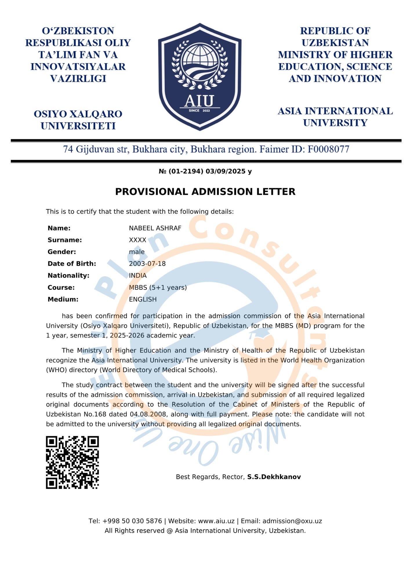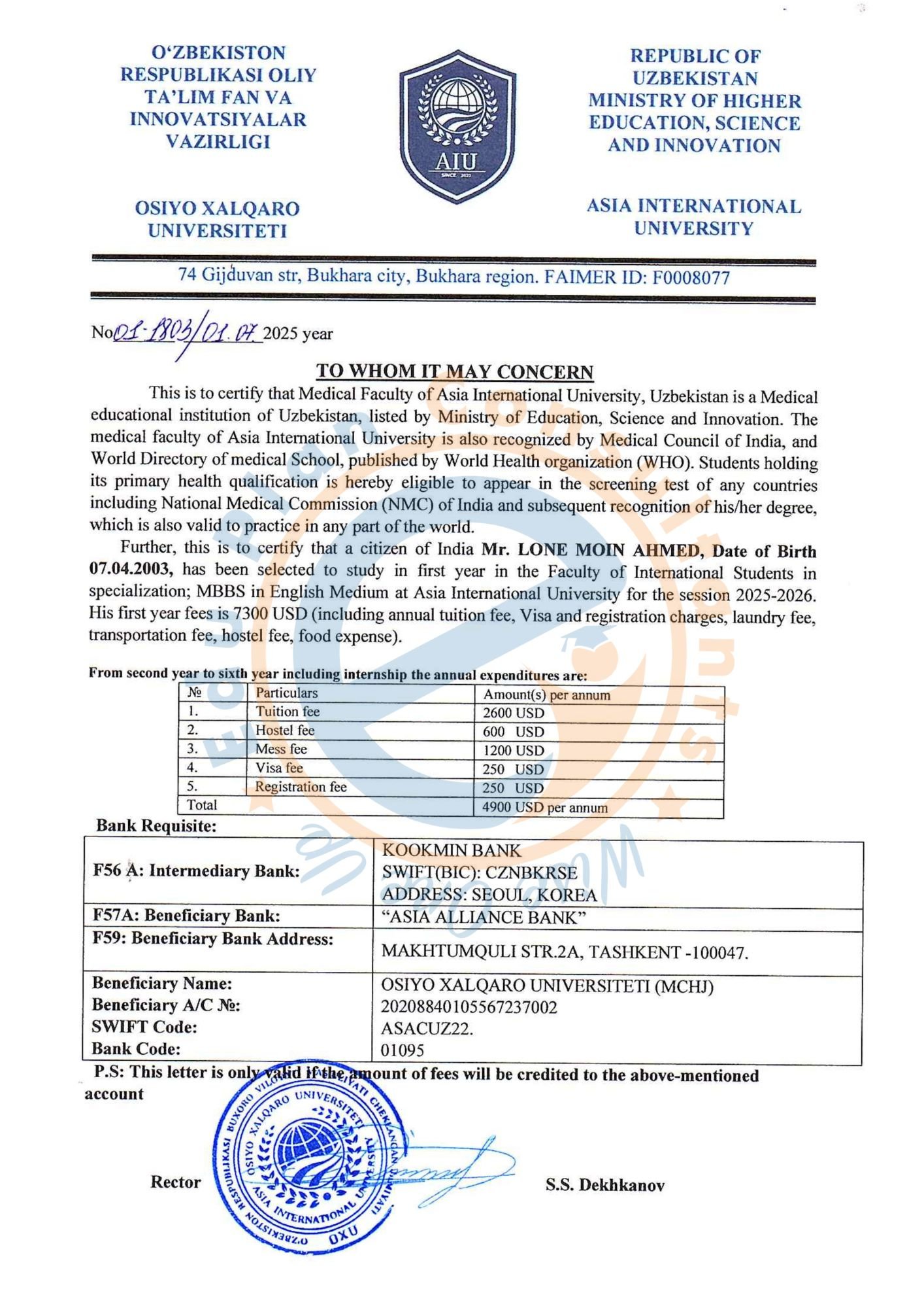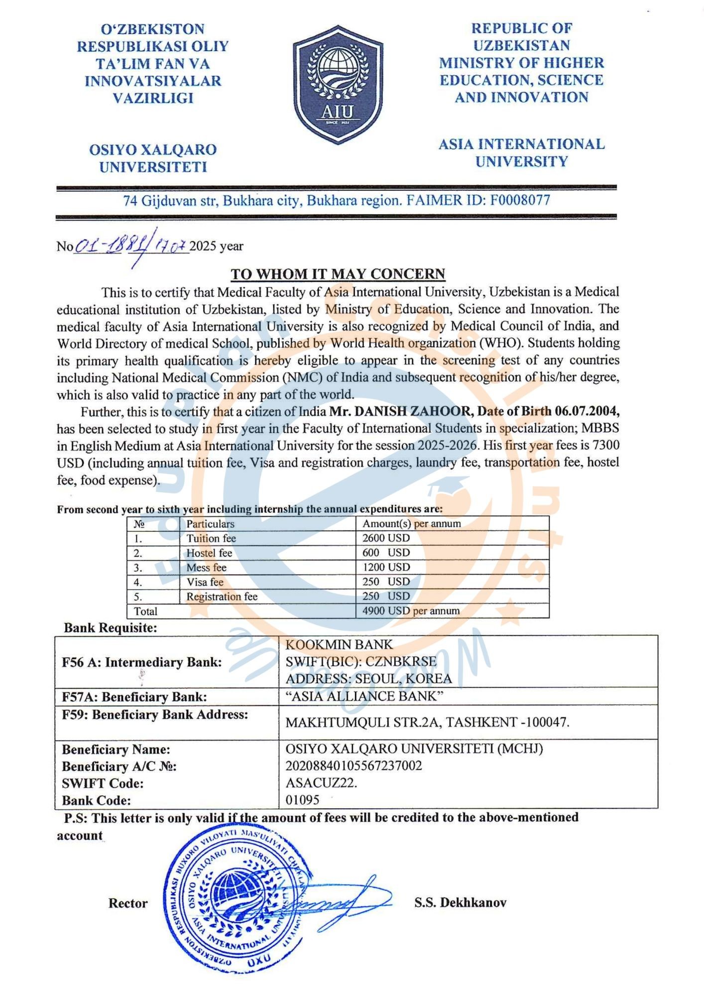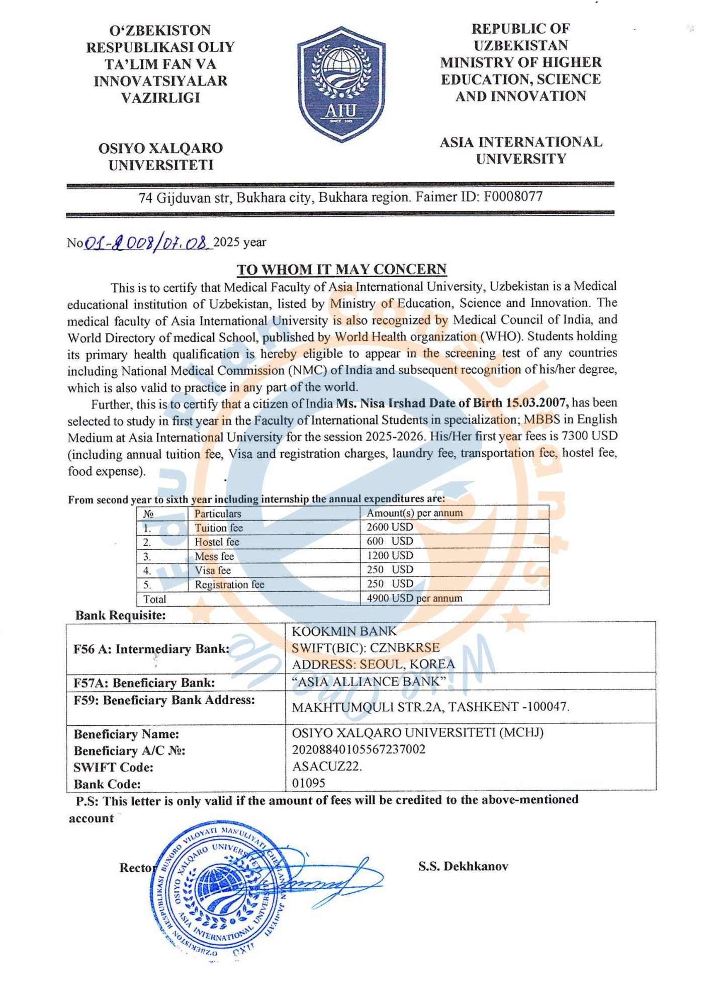 Uzbekistan's Asia International University - AIU, Bukhara Uzbekistan offers a five-year MBBS program that has been accepted by the NMC. The University is listed in the WHO directory of medical institutes.