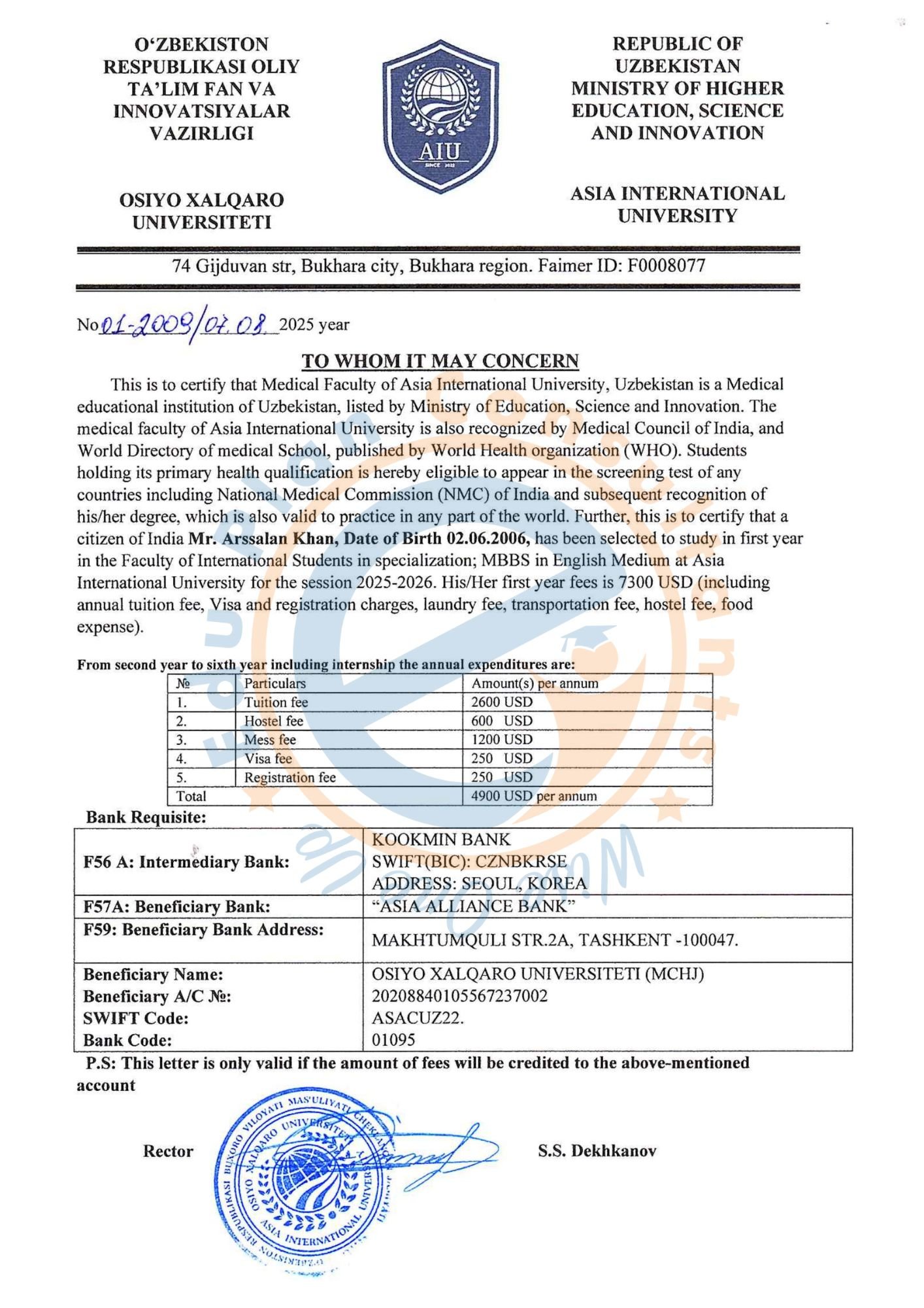Asia International University - AIU, Bukhara Uzbekistan (AIU) in Bukhara, Uzbekistan, has become a top destination for Indian medical aspirants seeking an NMC-recognized MBBS degree in English medium at affordable costs. AIU’s MBBS program strictly follows NMC guidelines, including a competency-based curriculum, 1:10 teacher-student ratio, and Indian faculty members who ensure seamless adaptation for Indian students. The university provides world-class infrastructure with modern labs, dissection halls, digital libraries, and affiliated hospitals for hands-on clinical training. With no donation or capitation fees, a straightforward admission process, and a safe, multicultural environment, AIU offers Indian students a high-quality medical education at nearly half the cost of private Indian Universitys.